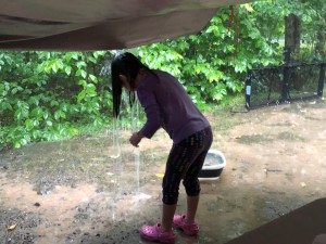 The little zoologist playing in the rain.